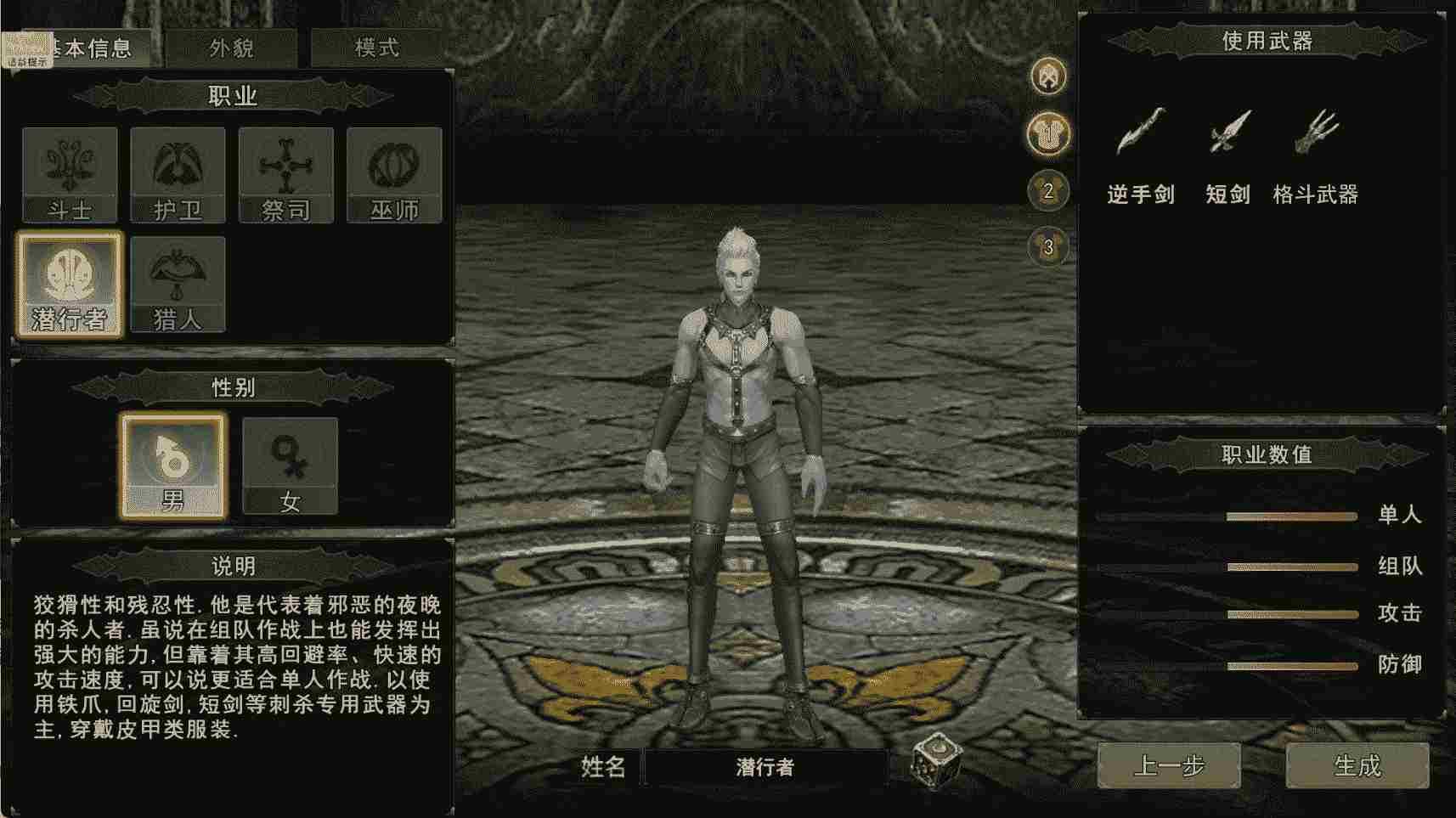 5. 潜行者:潜行突袭类职业,敏捷成长最高,外观轻便隐蔽,主打隐身爆发与单体收割,适配武器为逆手剑、短剑、格斗武器。