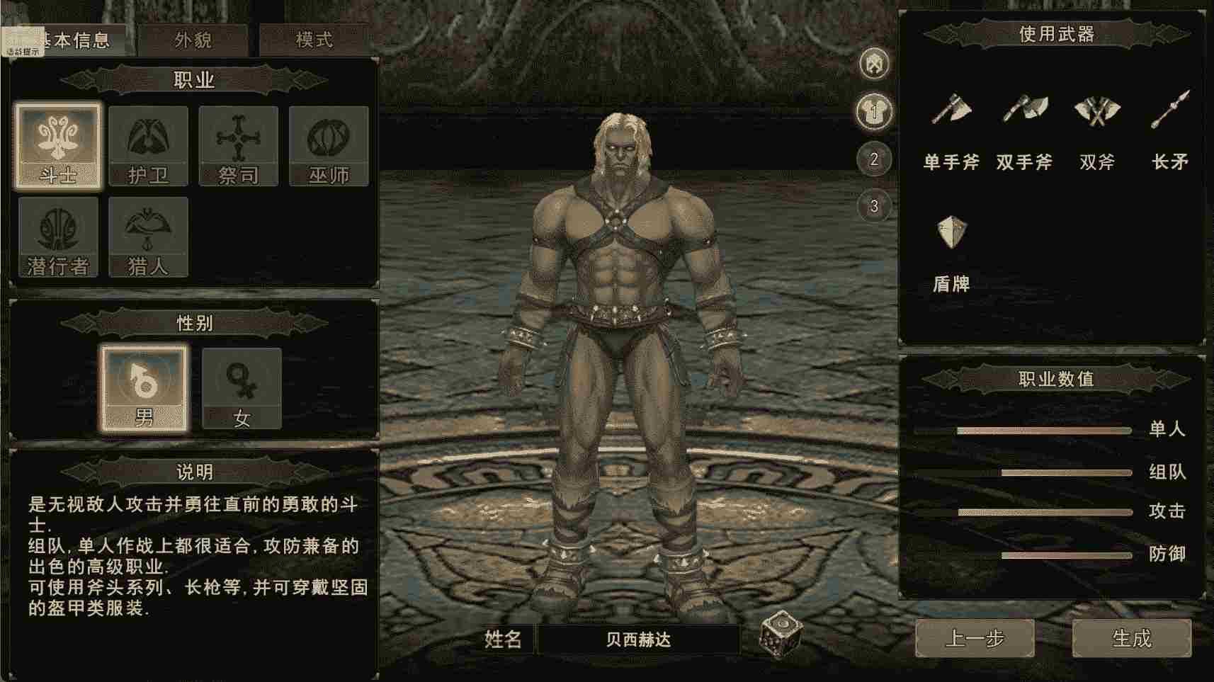 1. 斗士:近战狂暴输出核心,力量成长突出,外观狂野凶悍,主打持续物理爆发,适配武器为巨斧、长矛、盾牌。