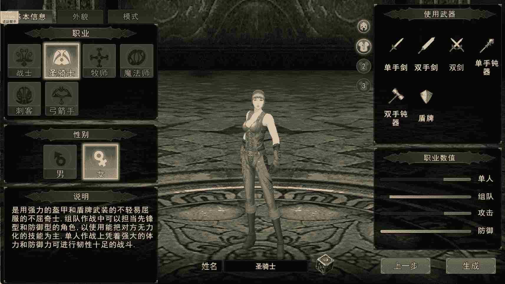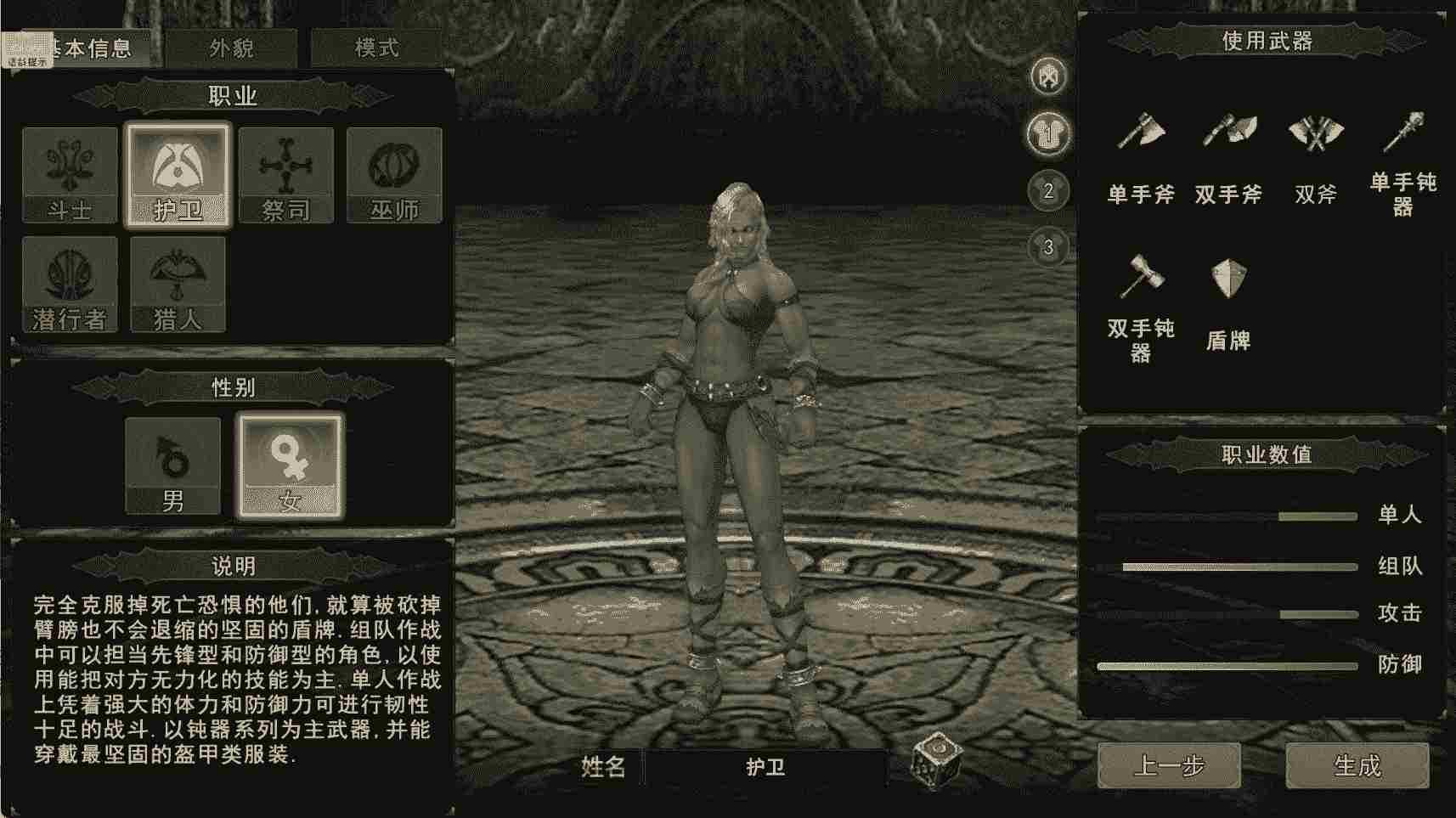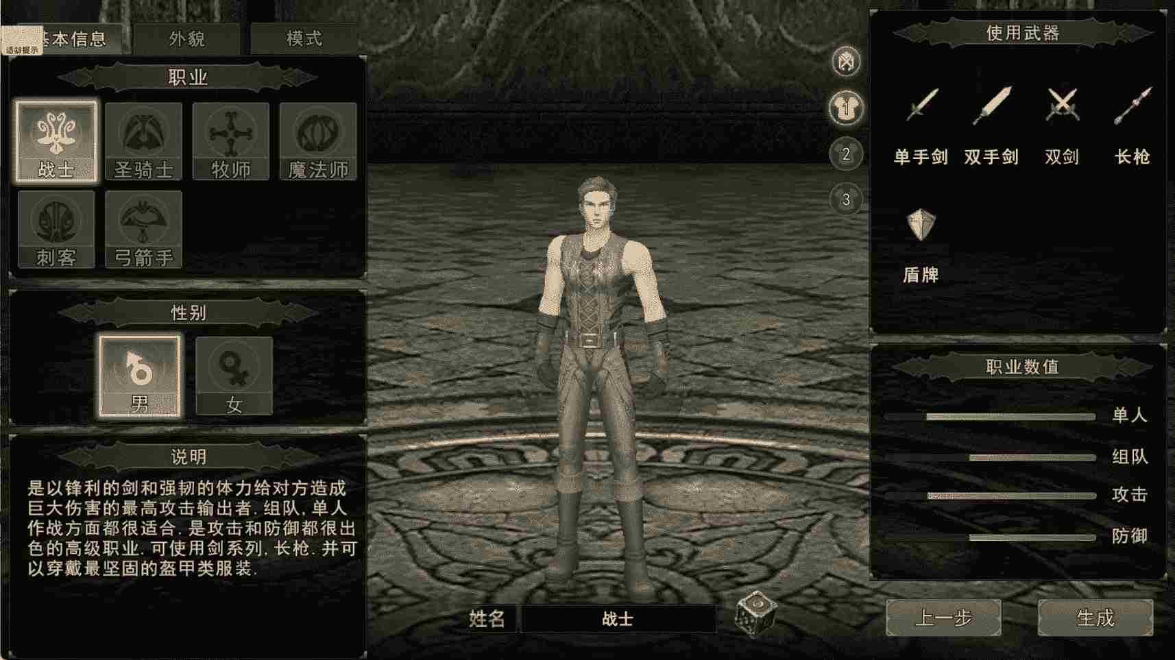 1. 战士:近战均衡输出,力量与体质兼顾,外观正气硬朗,可输出可承伤,适配武器为单手剑、双剑、长枪、盾牌。