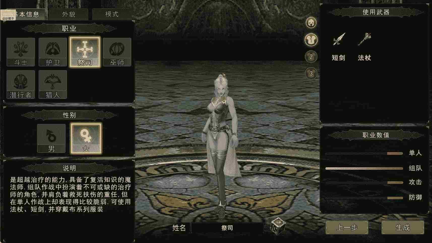 3. 祭司:黑暗系治疗辅助,以精神属性为主导,外观神秘冷峻,兼顾队友治疗与敌方减益效果,适配武器为法杖、短剑。