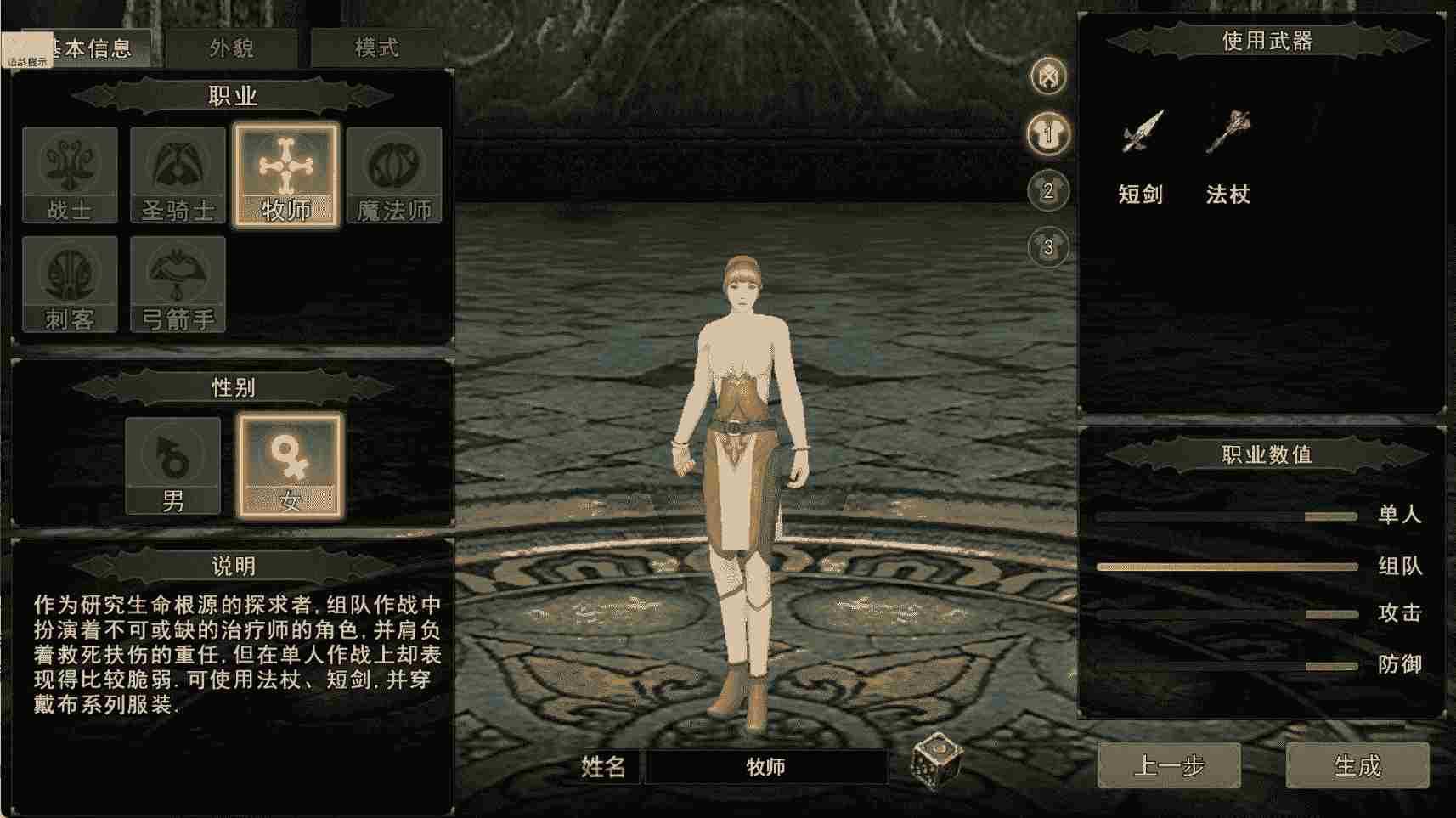 3. 牧师:光明系治疗辅助,精神属性拉满,外观温柔圣洁,承担团队续航与复活职责,适配武器为法杖、短剑。